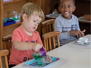 Give each child individual attention and breakfast if parent requests. Early arrivals play with older children, build puzzles, page through books, and build large Lego or other playful activities inside and outside, all activities on the shelves, lessons in grace and courtesy.